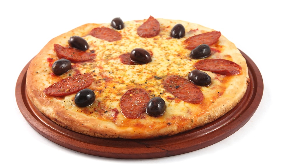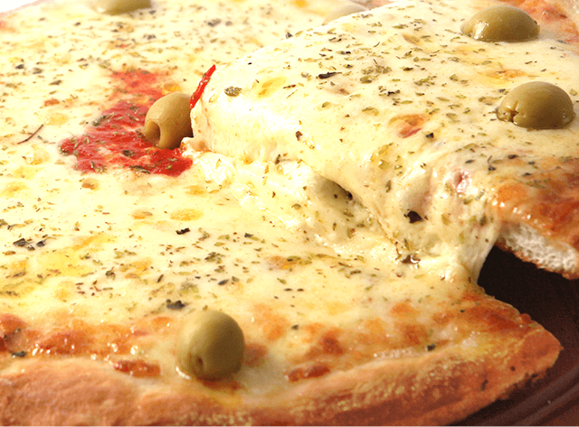 Muzzarella, salsa de tomate, cantimpalo, oregano y aceitunas negras.
