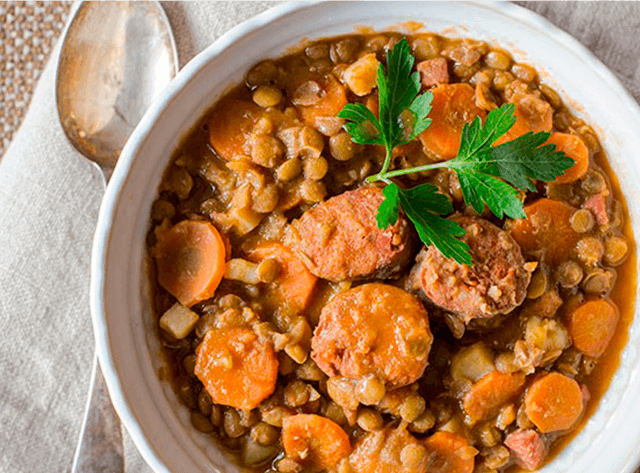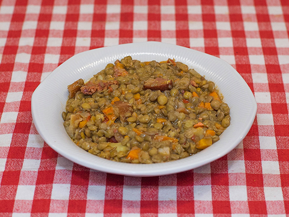 Guiso de lentejas a la española con panceta ahumada y chorizo colorado.