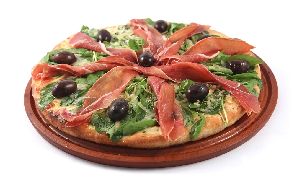 Muzzarella, salsa de tomate, rucula, parmesano, jamon crudo, oregano y aceitunas negras.