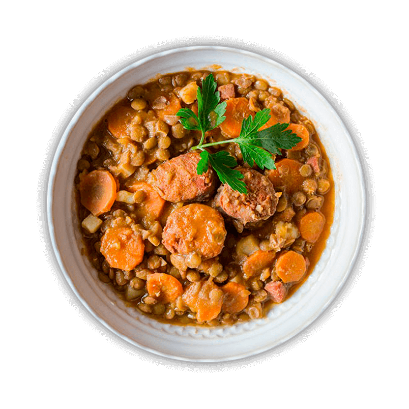 Guiso de lentejas a la española con panceta ahumada y chorizo colorado.
